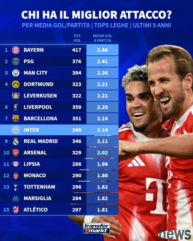 The German transfer market has compiled statistics on the average number of goals scored by teams in the five major leagues in the past five years and listed the list. Bayern leads the list with 2.86 goals, followed by Paris and Manchester City.