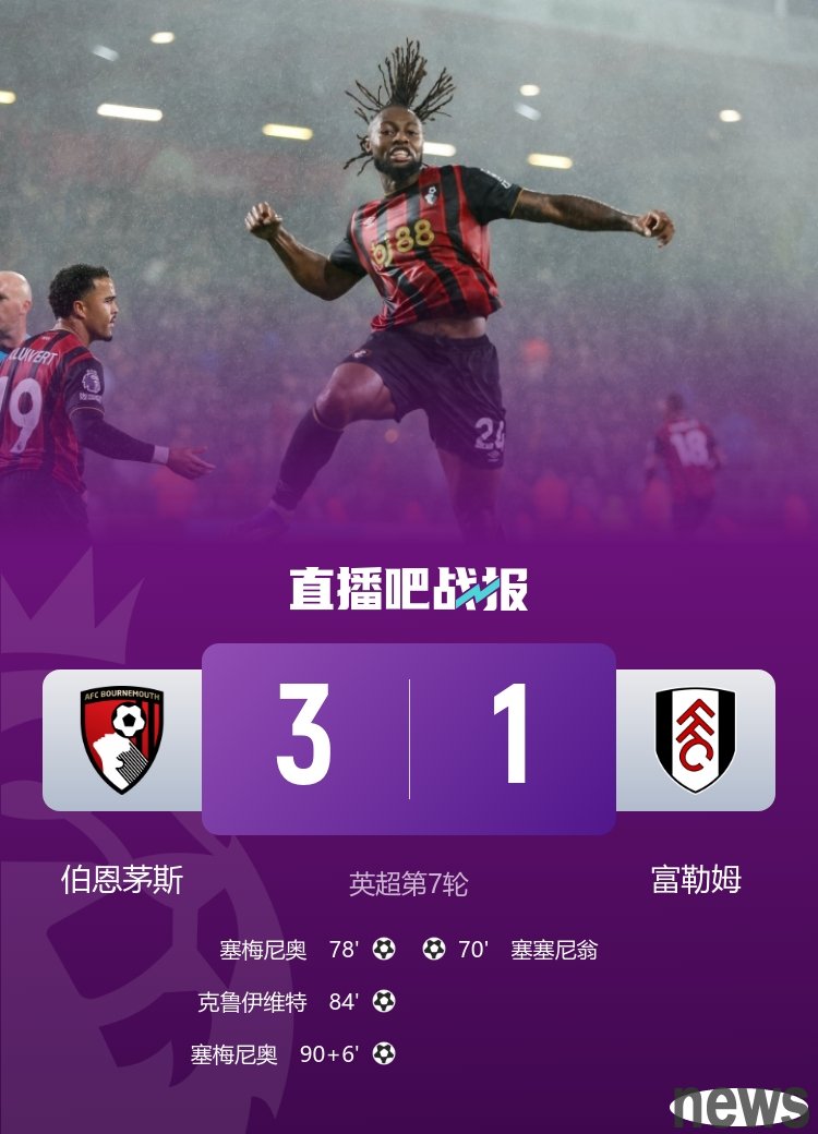 The first game in the seventh round of the Premier League in the early morning of this morning. Bournemouth defeated Fulham 3-1 at home, and temporarily rose to second place in the standings without losing in the last 6 rounds of the league.