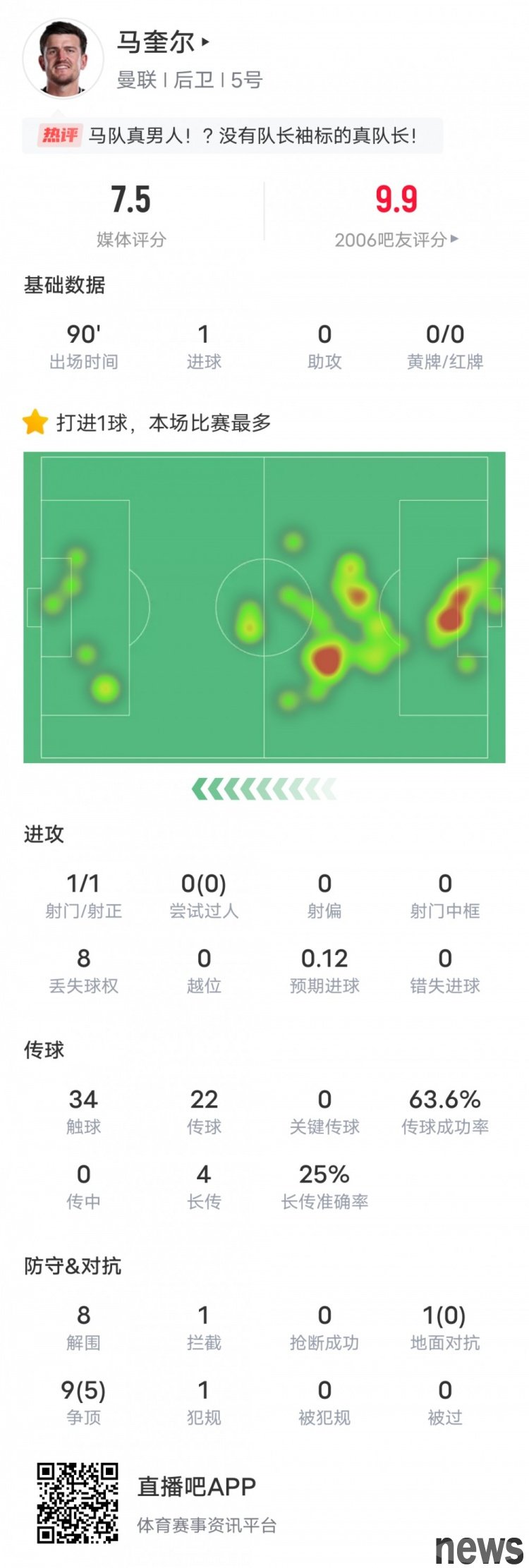 In terms of full-game statistics, Maguire scored the winning goal in this game, made 8 clearances, intercepted 1 time, succeeded in 5 of 9 aerial duels, touched the ball 34 times, and passed 22 times. His friend rating was 9.9.