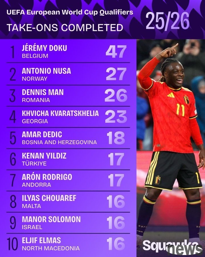 This World European Preliminary Group Stage has come to an end. Squakwa also counted the number of successful dribbles in this tournament, and Doku Cliff leads the way. The list of successful dribblers in this World European Preliminary: 1. Jeremy D...